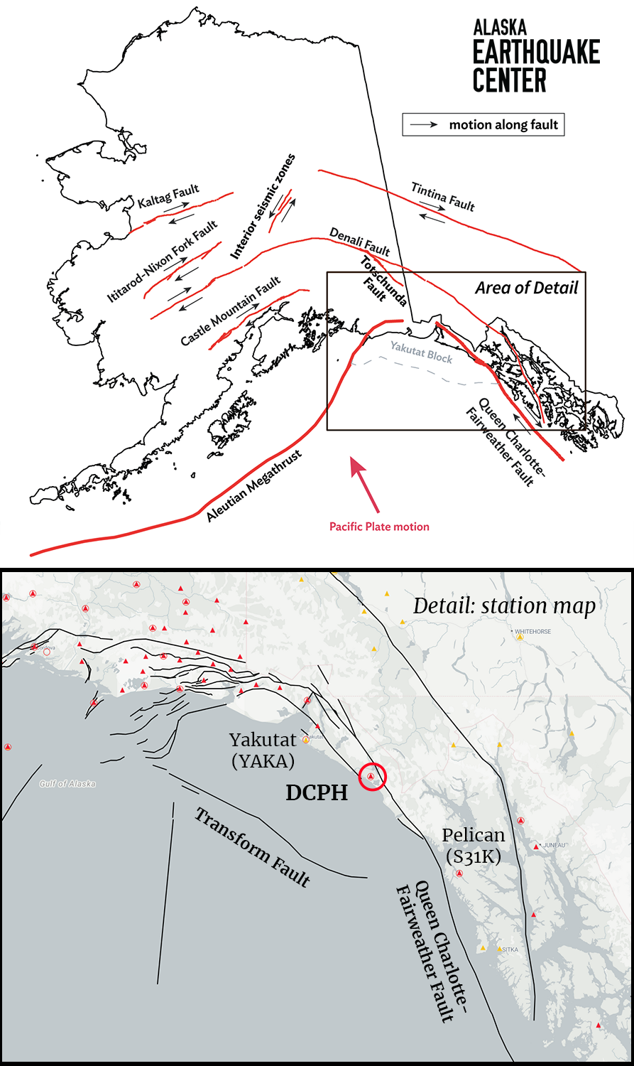 This station, the only one between Yakutat and Pelican, could be a critical spot in the future as we work toward an earthquake early warning system for Alaska. In this area, there is a history of large earthquakes from both onshore strike-slip faults and the offshore subduction zone. “DCPH practically sits on the Fairweather Fault, so it’s a pivotal station for monitoring earthquakes there and in the Yakutat transition area,” said Michael West, director of the Earthquake Center (Figure 1). The station also provides data to the National Tsunami Warning Center, which relies on fast and accurate magnitude and location determinations to issue tsunami warnings in the wake of large offshore earthquakes.