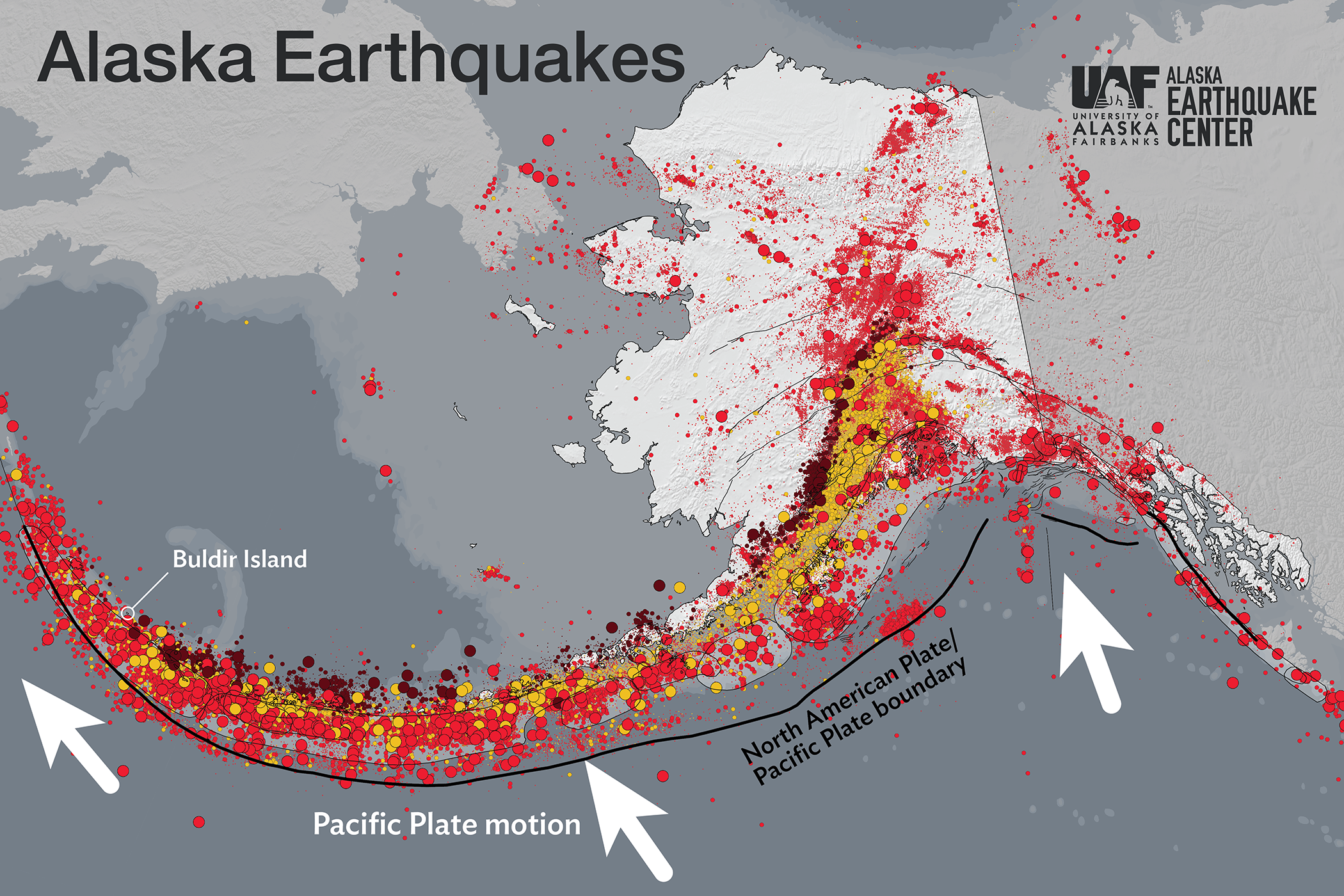 But in the far western Aleutians, the motion between the plates begins to change direction. Instead of pushing directly beneath North America, the Pacific Plate moves more parallel to it. As a result, the stress in the crust shifts from mostly squeezing to more sideways sliding, producing the strike-slip earthquakes we’re seeing here.