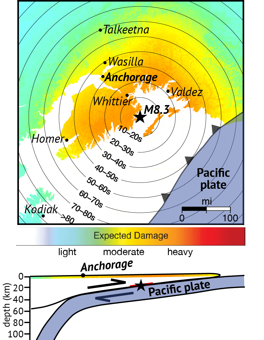 This illustration shows the potential alert times provided by an early warning system for a magnitude 8.3 earthquake in Alaska’s Cook Inlet region. Circles show how many seconds of warning are possible. Colors represent expected shaking intensity. Graphic by Alex Fozkos, Alaska Earthquake Center.