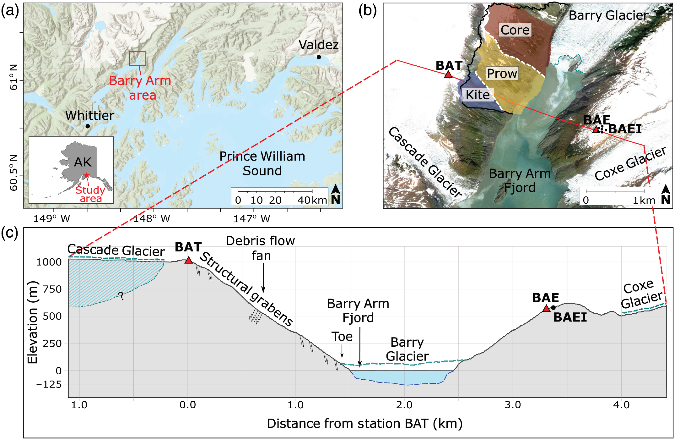 Figure 3. (a) Location of the Barry Arm area in relation to Prince William Sound and nearby communities, as well as location in relation to Alaska. (b) Barry Arm fjord detail showing the location of the Cascade, Coxe, and Barry Glaciers, as well as seismic stations BAT and BAE, and infrasound BAEI, and where the cross section is taken. The colored sections of the slope indicate the Kite (blue), Prow (yellow), and Core (red)—these locations are where the slope is most active. (c) Barry Arm fjord cross‐section diagram (1:1 scale) illustrating glacier features, fjord depth (slope profile derived from Google Earth; Google, n.d.), station locations, and structural features modified from Schaefer et al. (2023) Boundary for Cascade Glacier is inferred. (Figure and caption from https://doi.org/10.1785/0220250205.)
