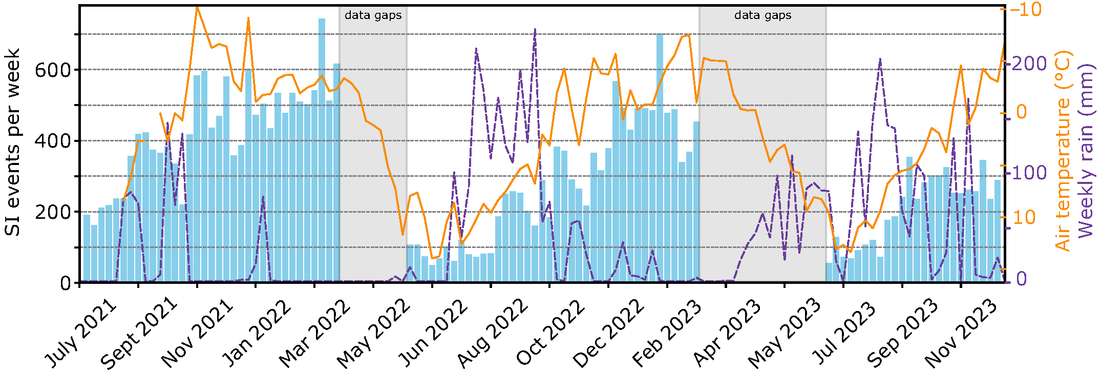 Figure 5. Histogram of SI events overlain with air temperature (orange) and weekly rainfall (purple) from July 2021 to December 2023. Note the data gaps in seismic stations from April to May 2022 and March to June 2023. (Figure and caption from https://doi.org/10.1785/0220250205.)