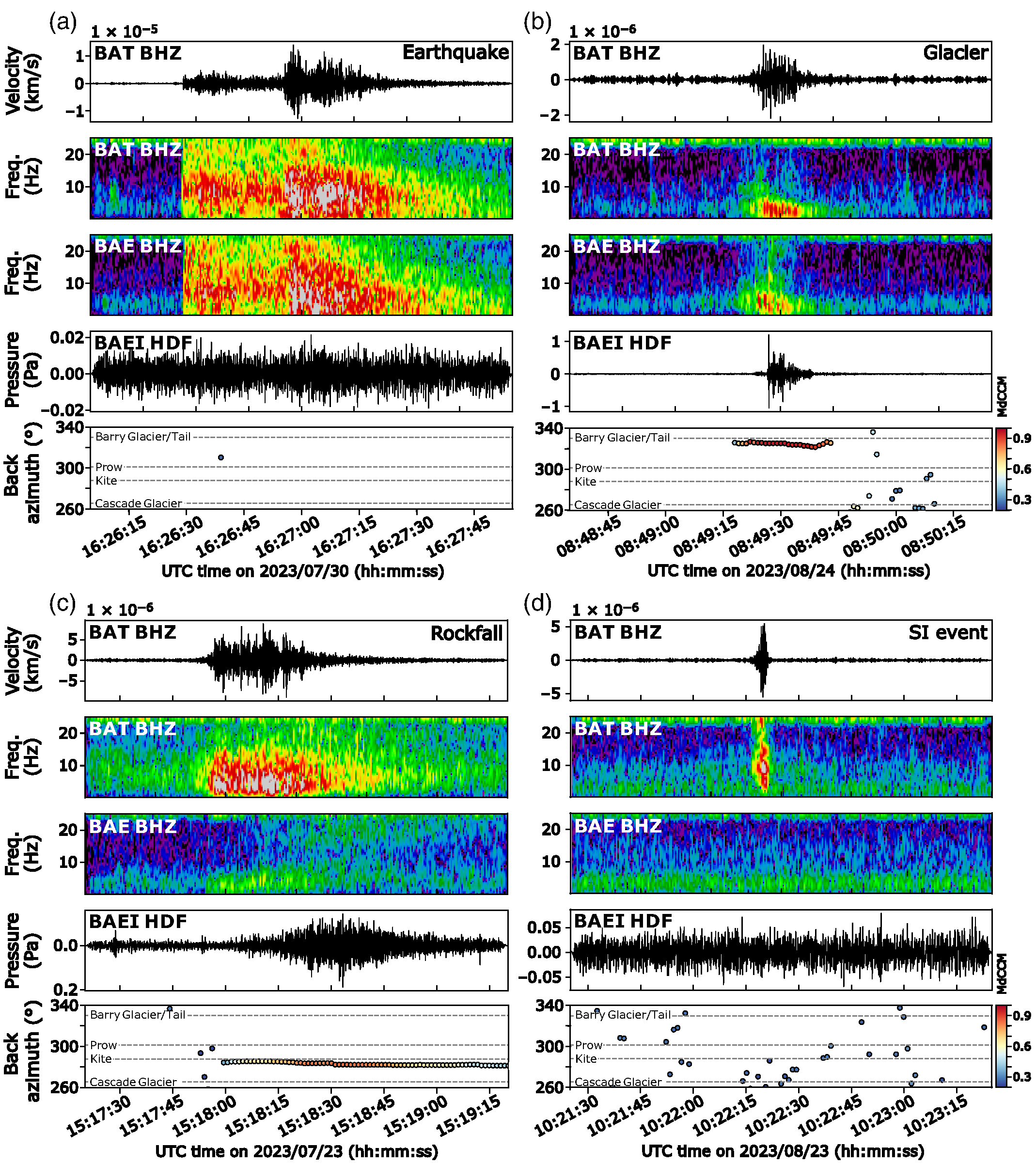 Figure 4. Seismogram, spectrogram, and infrasound (top to bottom) of an (a) earthquake, (b) glacier event, (c) rockfall, and (d) short‐impulsive (SI) event. Note that SI events do not appear on infrasound, nor station BAE, whereas rockfall and glacier events are present on infrasound and both seismic stations, and earthquakes are visible on both seismic stations. (Figure and caption from https://doi.org/10.1785/0220250205.)