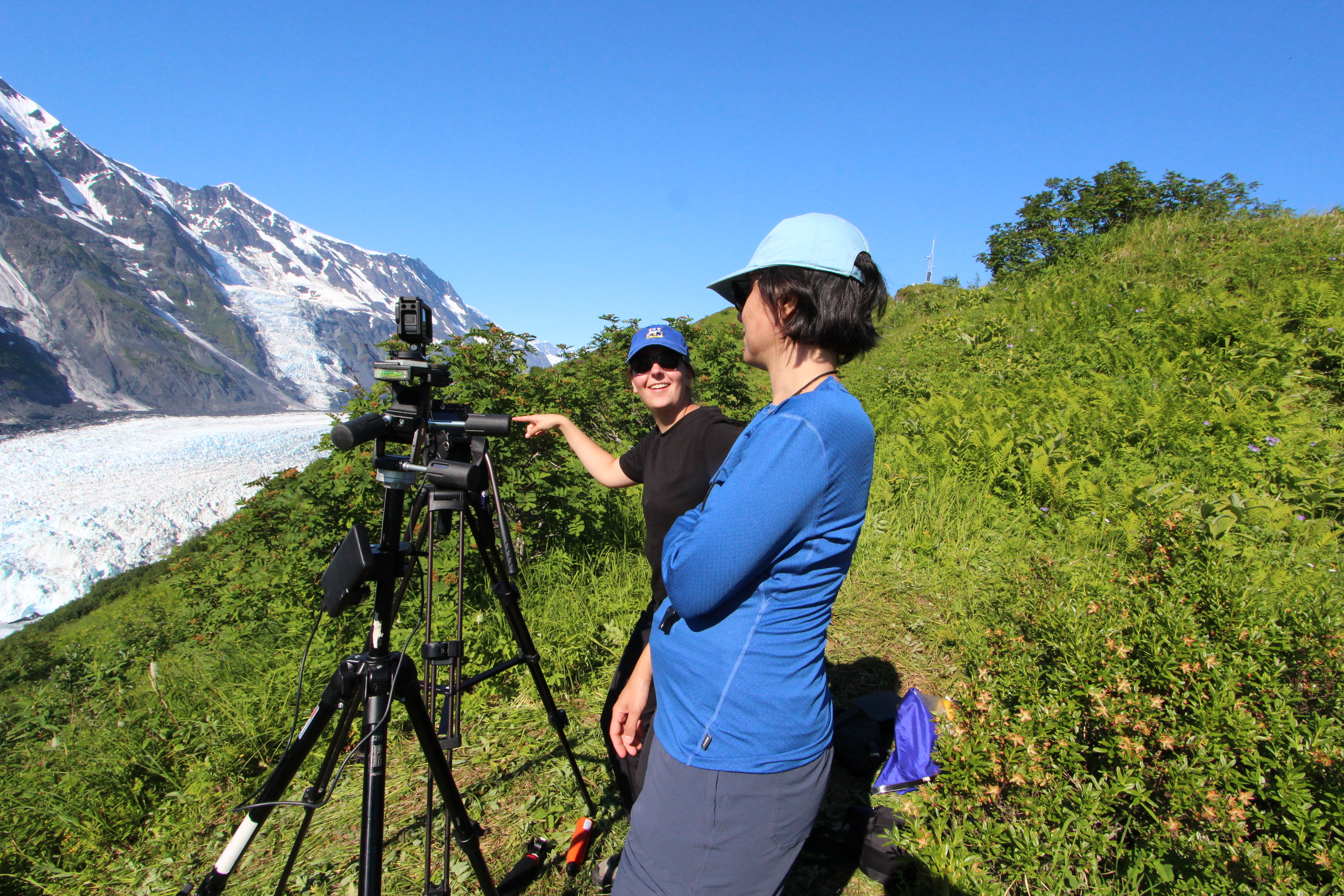 Two women setting up digital cameras on tripods, with glacier and mountains in the left background.